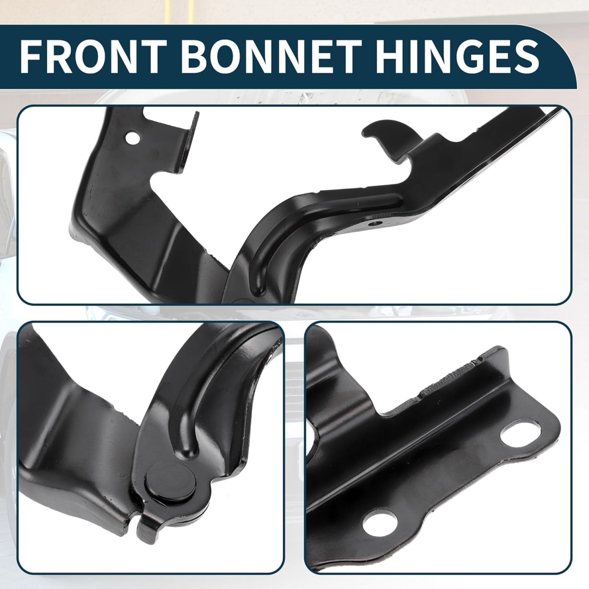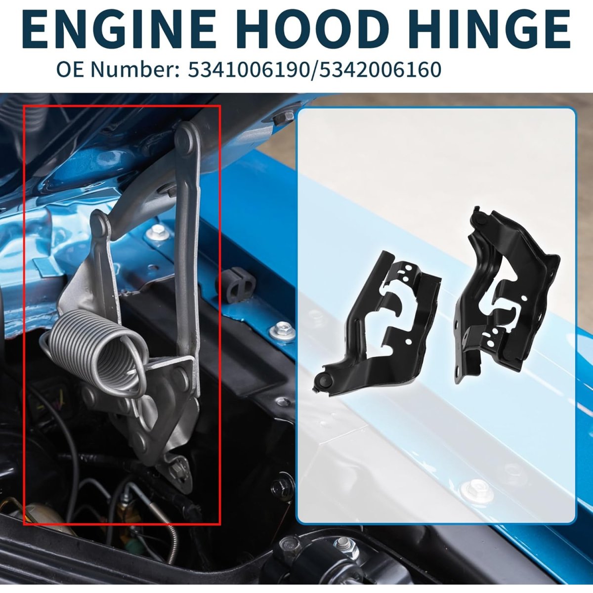 - Easy Installation:Easy to install, The hood hinge is the connection between the hood and the car body. The lower hinge arm is mounted laterally on the vehicle body structure, and the upper hinge arm is connected to the engine hood. Direct bolt-on installation.
